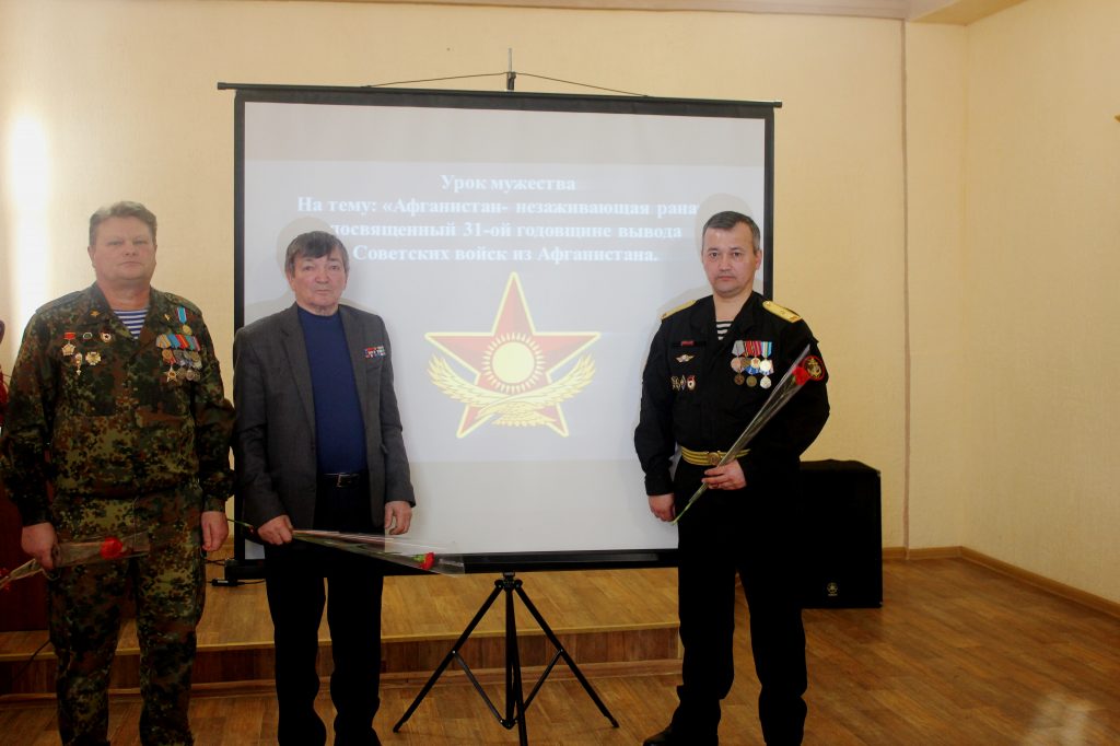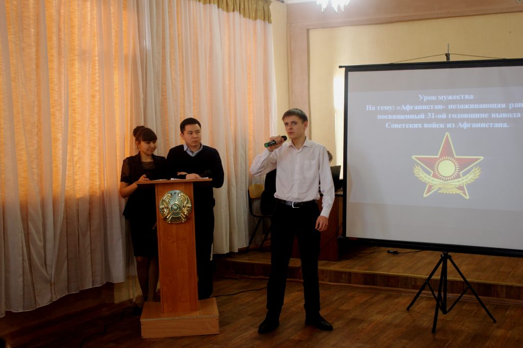 12 февраля 2020г. в Северо-Казахстанском профессионально-педагогическом колледже прошел урок мужества на тему: «Афганистан - незаживающая рана», посвящённый 31-ой годовщине вывода Советских войск из Афганистана. Цель урока: воспитывать у студентов любовь к своей Родине, чувство долга перед Отечеством, уважение к воинам-интернационалистам.