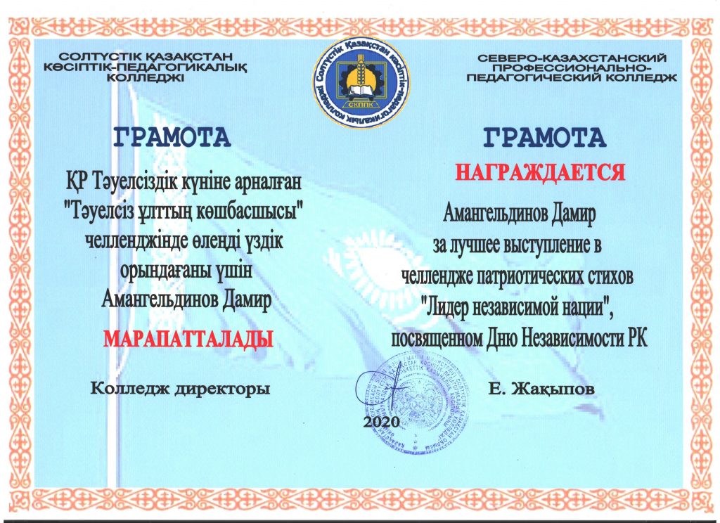 9 декабря 2020 г. в рамках празднования Дня Независимости Республики Казахстан среди студентов 1-4 курсов Северо-Казахстанского профессионально-педагогического колледжа был проведен челлендж патриотических стихов «Тәуелсіз ұлттың көшбасшысы».